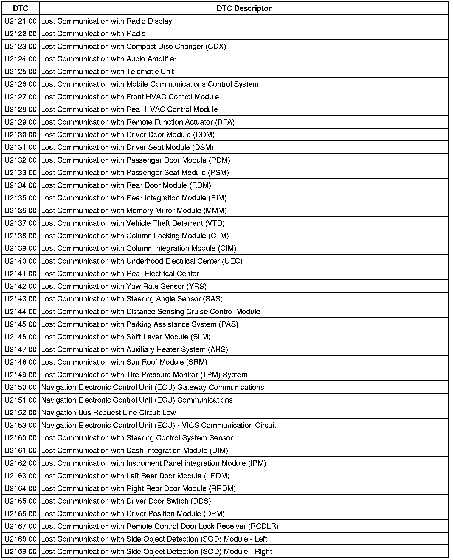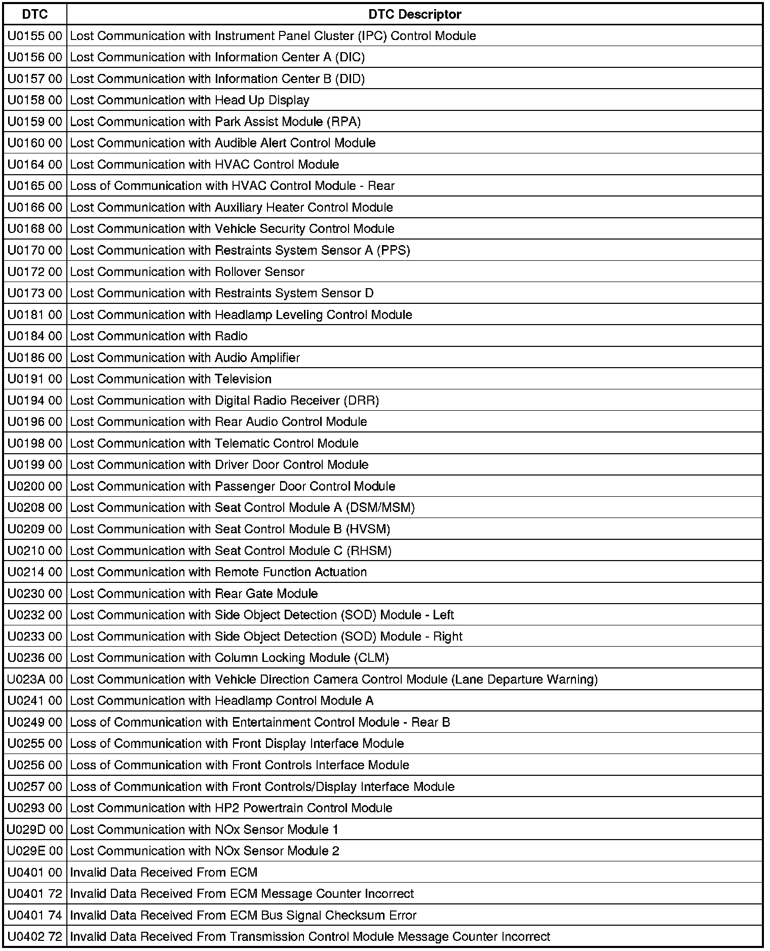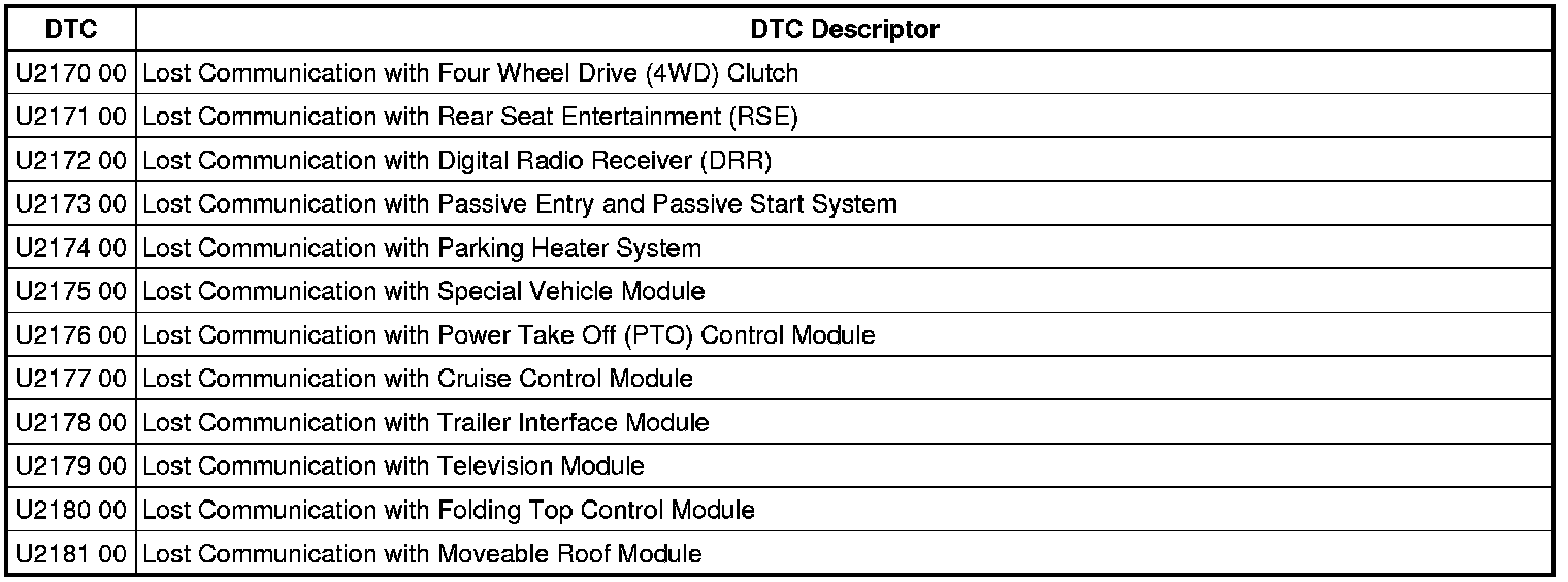 This list includes all Data Communications related U-code DTCs in alphanumeric order with descriptors for all modules. Not all DTCs listed will be applicable to all vehicles.