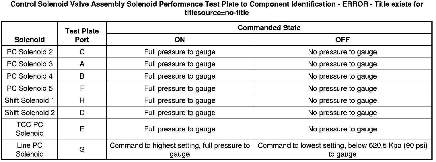 A pressure gauge is used to measure the pressurized air through the solenoid control ports. When a solenoid is commanded ON with the scan tool, pressurized air flows through the solenoid control port and displays on the pressure gauge. When the solenoid is commanded OFF with the scan tool, there is no pressurized air flow through the solenoid control port to the pressure gauge. The recommended shop air pressure for this test is 620.5-690.4 Kpa (90-100 psi).