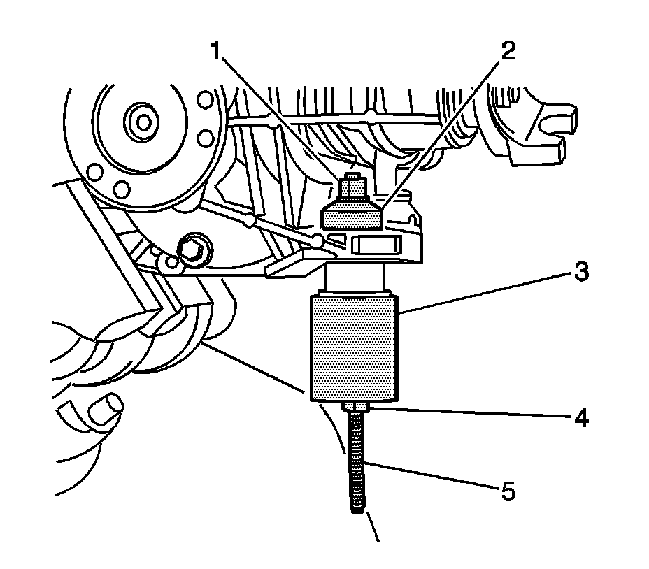 2. Install the J 45850-2 (3), the J 45850-3 (2), the forcing screw, the thrust bearing, and the nuts (1, 4-5) over the differential carrier assembly bushing as shown.