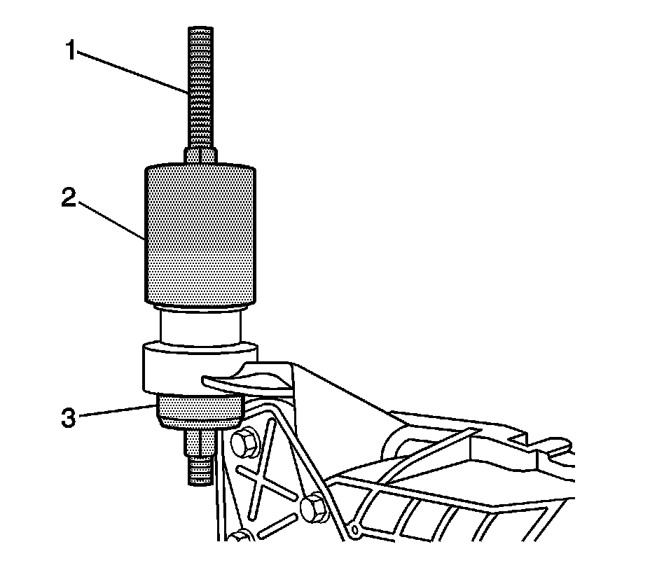 1. Install the J 45850-2 (2), the J 45850-3 (1), the forcing screw, the thrust bearing, and the nuts (3) over the differential carrier assembly bushing as shown.