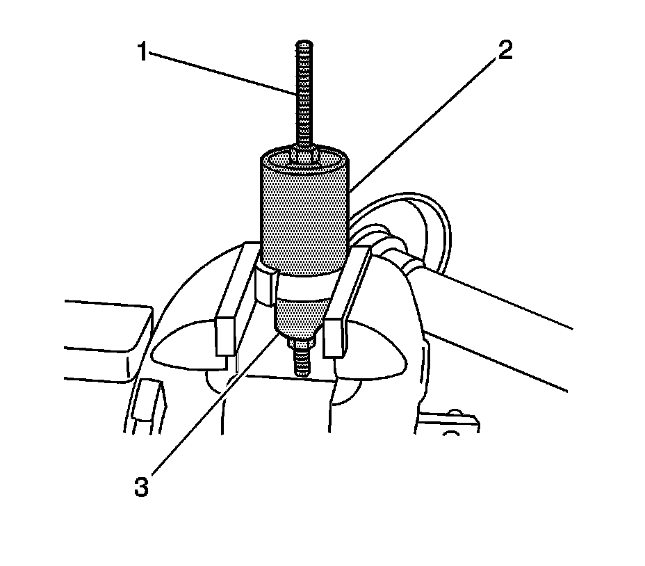 11. Install the J 45850-2 (2), J 45850-3 (1), the forcing screw, bearing, washers and nuts (1) over the lower inner shaft housing bushing as shown.