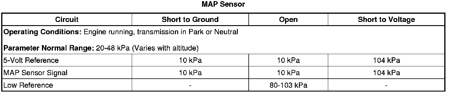 * The BARO that is used by the ECM to calculate the air flow models is initially based on the MAP sensor at ignition ON. When the engine is running, the ECM will continually update the BARO value near wide open throttle using the MAP sensor and a calculation. A skewed MAP sensor will cause the BARO value to be inaccurate. Use the scan tool and compare the BARO parameter at ignition ON to the Altitude vs. Barometric Pressure Table. Refer to Altitude Versus Barometric Pressure Altitude Versus Barometric Pressure.
