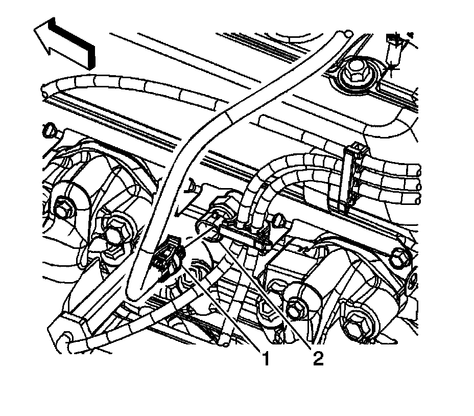 3. Disconnect the engine wiring harness electrical connector (1) from the engine coolant temperature (ECT) sensor (2).