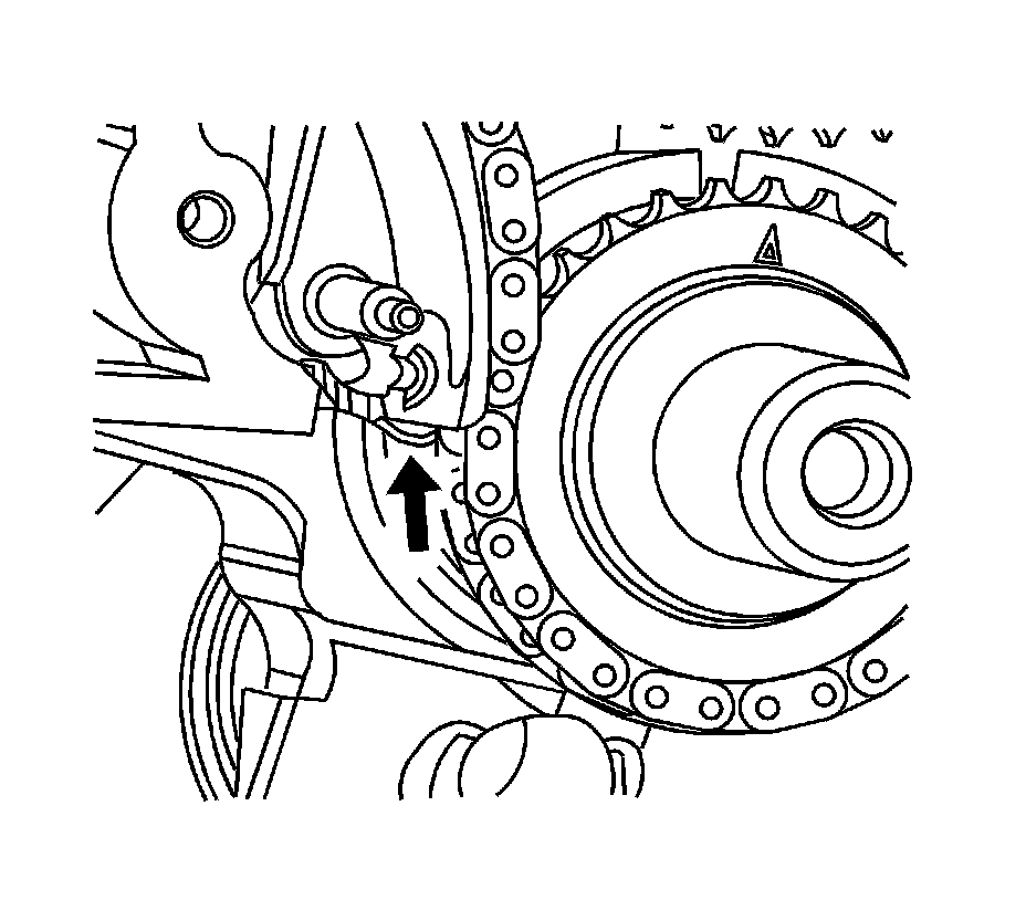 6. Install the timing chain tensioner shoe onto the bracket and position the top of the shoe under the tab at the top of the bracket.