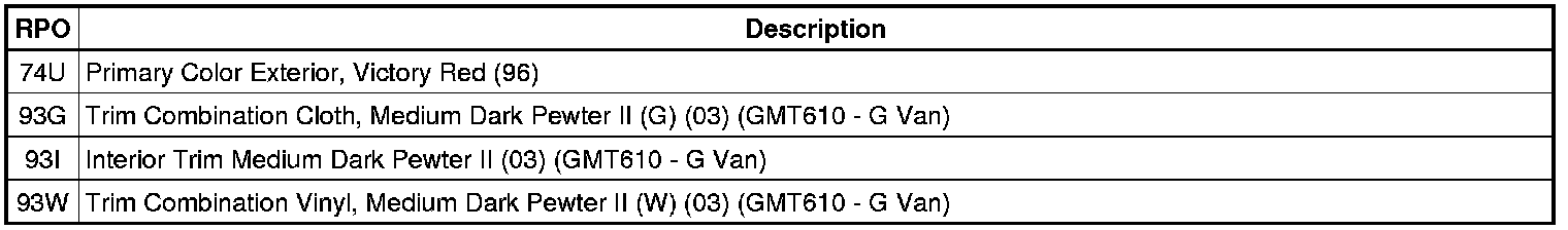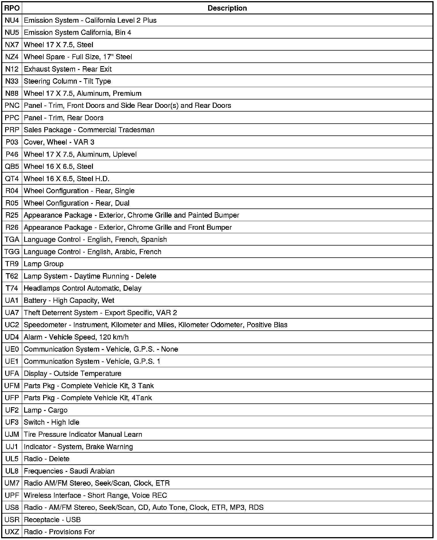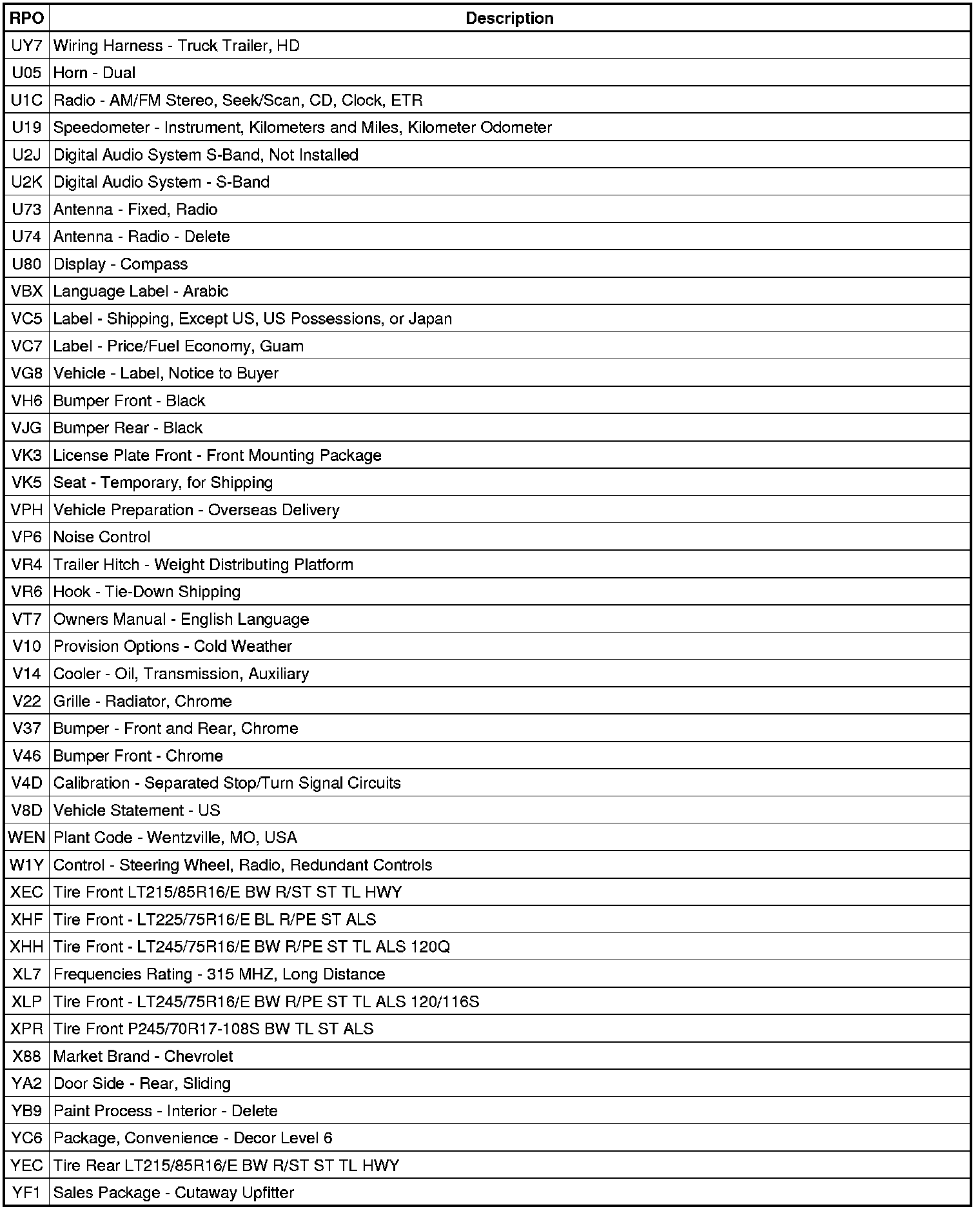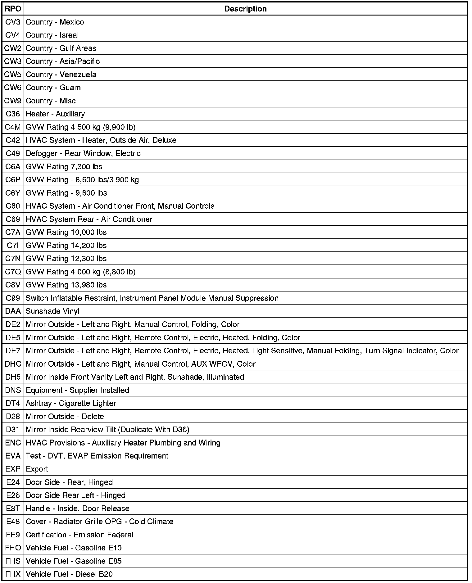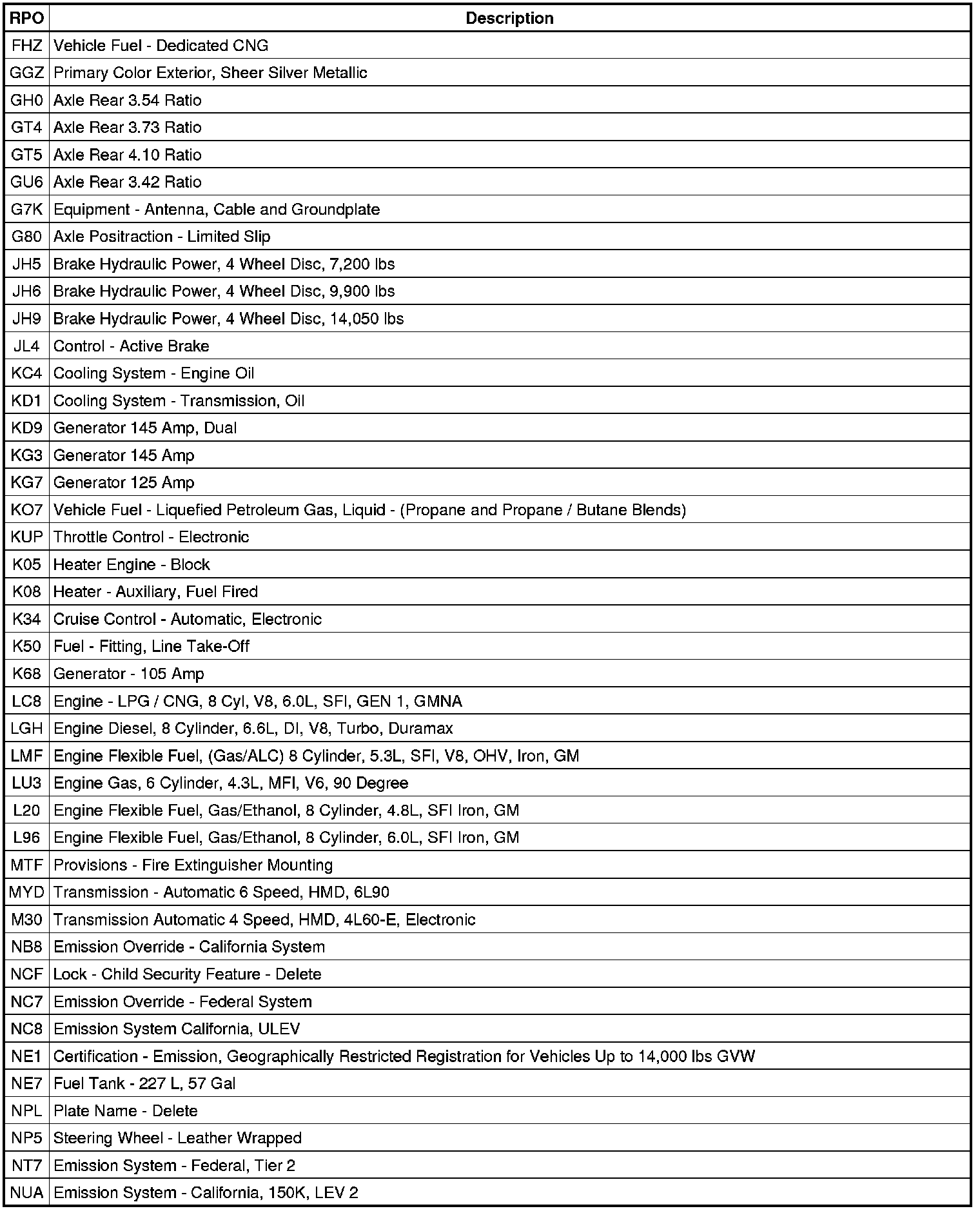 The production/process codes provide the description of the regular production options (RPOs). The RPO list is printed on the Service Parts Identification Label.