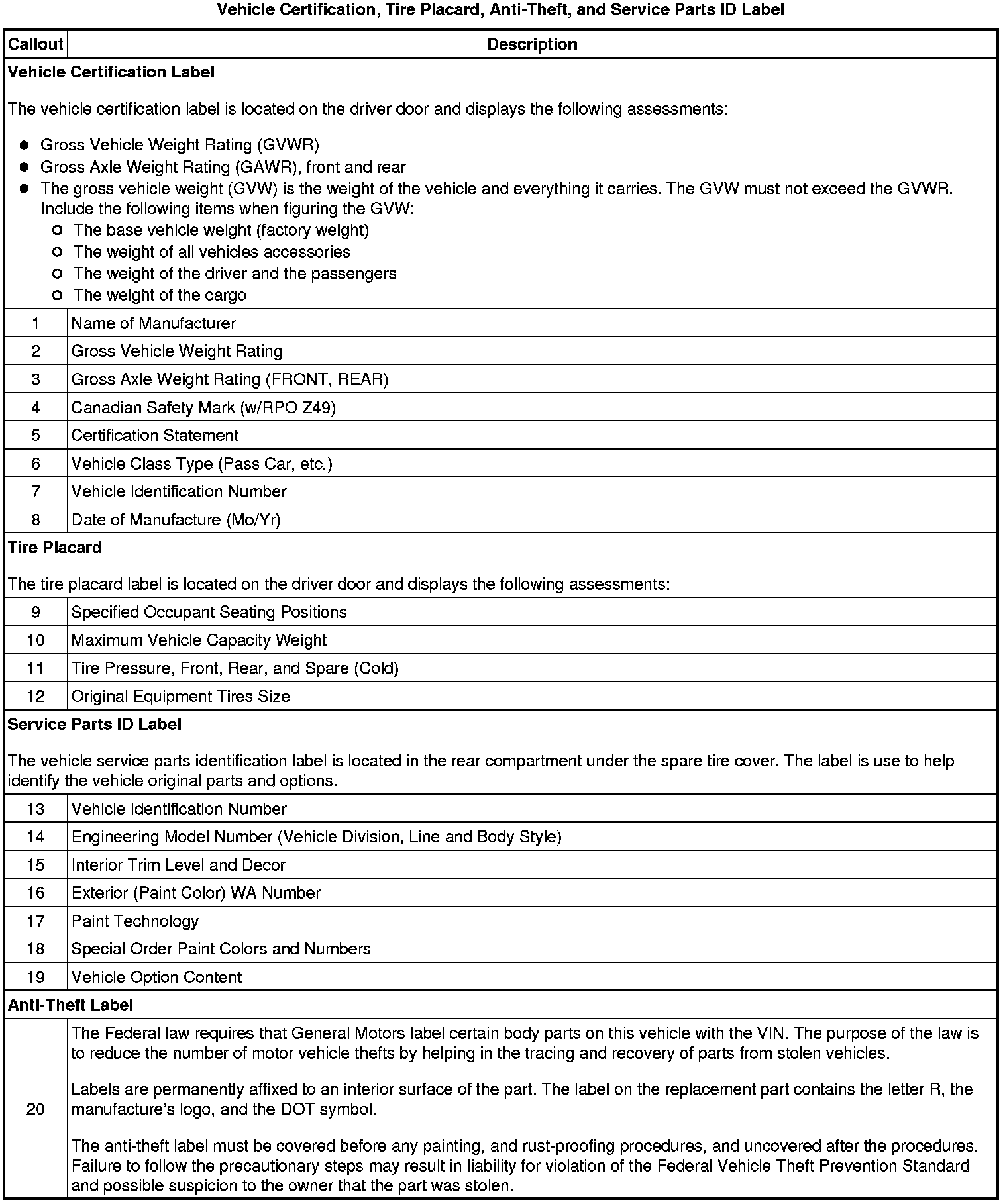 Vehicle Certification, Tire Placard, Anti-Theft and Service Parts ID Label