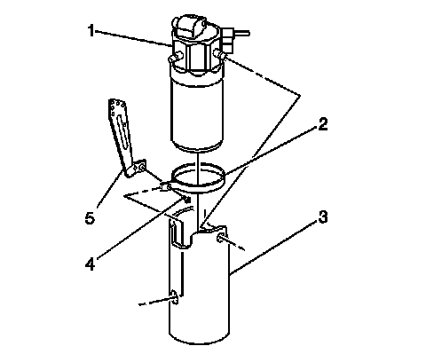 7. Remove the retaining screw (4) from the accumulator retaining bracket (2).