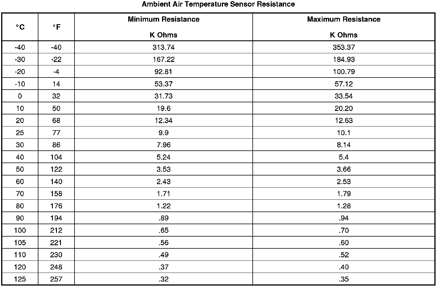 The following table will be used to measure the resistance of the ambient air temperature sensor and compare it with the actual ambient temperature. The driver information center (DIC) temperature display accuracy should be within 5 degrees of the actual temperature. The actual temperature should not be taken from a radio station, a sign displaying the temperature, etc. A temperature measuring tool such as a thermometer should be used. Some temperature measuring tools may be within 5 degrees of the actual temperature. Make sure to consult the manufacturer for the accuracy of the tool. This comparison can make the DIC temperature display seem off by 5-10 degrees of the actual temperature when it is not.