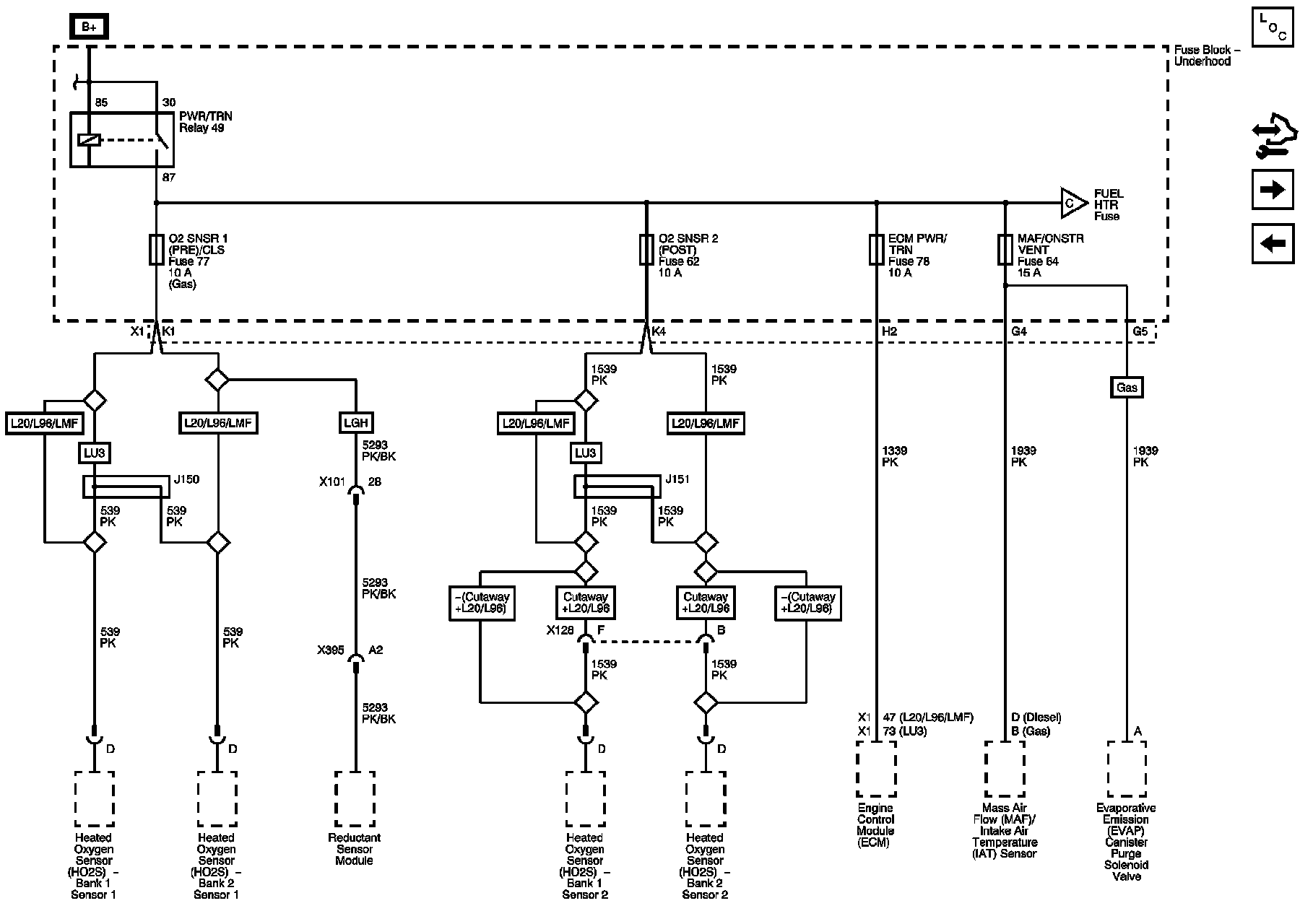 ECM PWR/TRN, MAF/CNSTR VENT, O2 SNSR 1 (PRE)/CLS, and O2 SNSR 2 (POST) Fuses