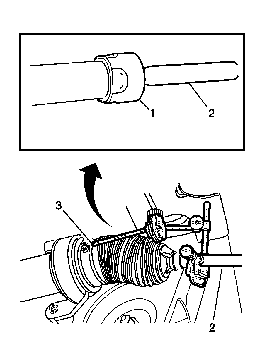 5. Install the J-8001 - Dial Indicatorbetween the inner tie rod (2) and the steering gear housing or the worm gear clamp in such a way as to measure the lash between the inner tie rod and the steering gear housing.