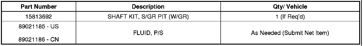 ** The amount identified in "Net Item" should represent the actual sum total of the current GMCC&A Dealer net price for actual amount of power steering fluid needed to perform the required repairs, plus applicable Mark-Up or Landed Cost (for Export).