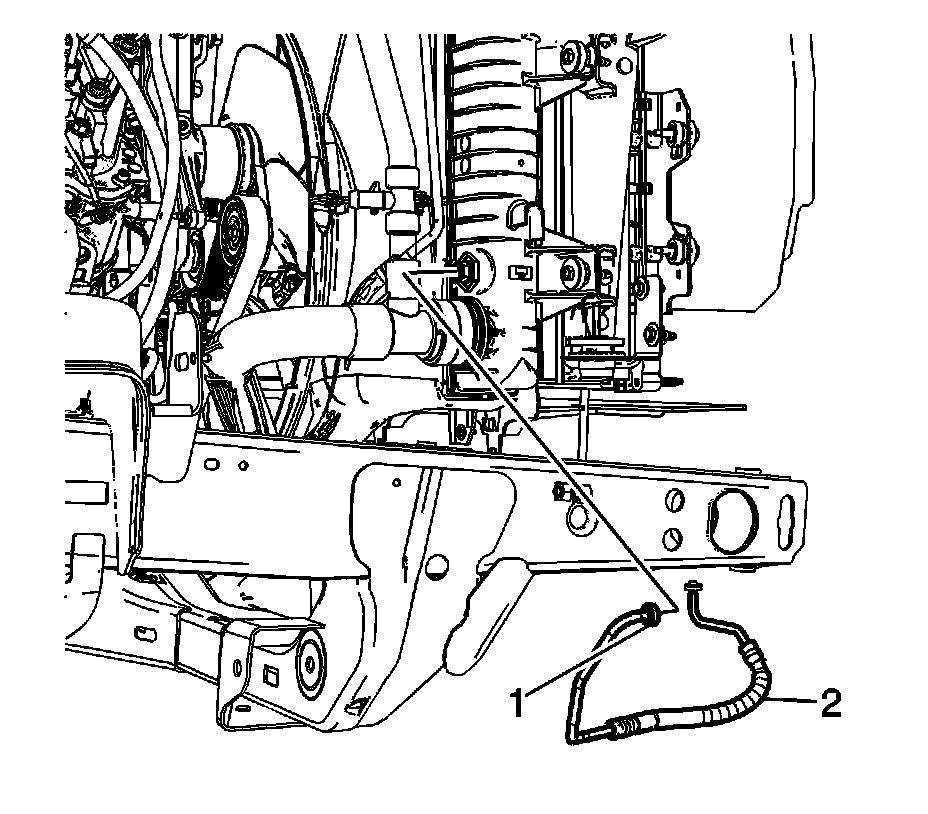 4. Disconnect the transmission fluid auxiliary cooler inlet hose (1) from the auxiliary oil cooler. Refer to Transmission Fluid Cooler Hose/Pipe Replacement Transmission Fluid Cooler Hose/Pipe Replacement
