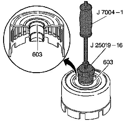 2. Using the J 25019-16 which is part of J 25019 - bushing service setwith the J 7004-A - remover, remove the reverse input clutch front bushing (603).