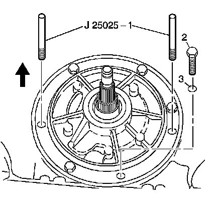 9. Install the remaining pump to case bolts (2) and O-ring seals (3), in the holes where the J 25025-1 - mounting postwere. Tighten the bolts to 29 Nm (21 lb ft).