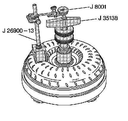 2. Install the J 35138 - converter end play checker, the J 26900-13 - indicator baseand the J 8001 - dial indicator setor J 39195 - end play check toolto be used with the 300 mm torque converter.