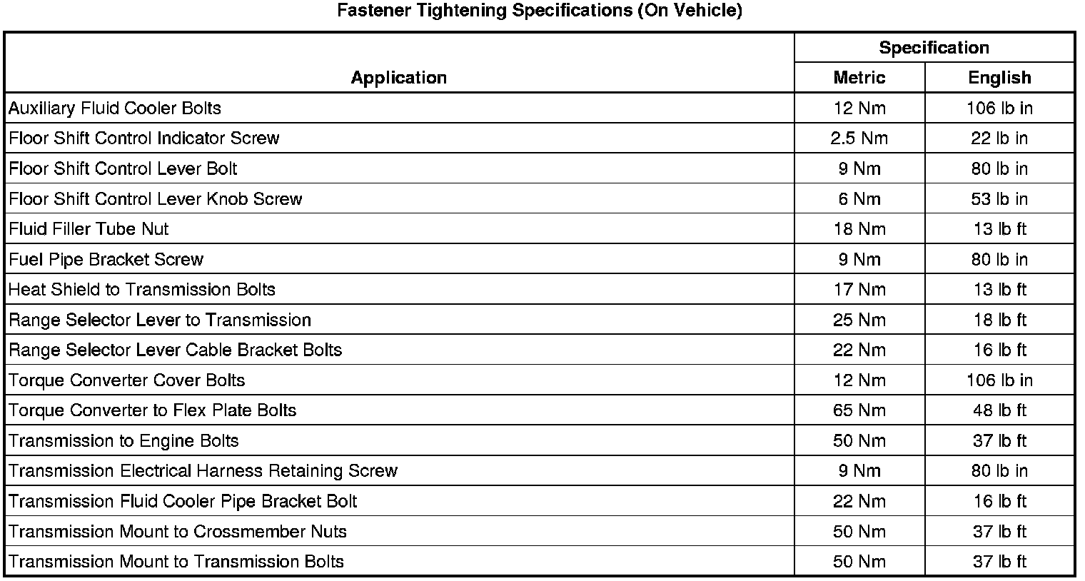 Fastener Tightening Specifications (On Vehicle)