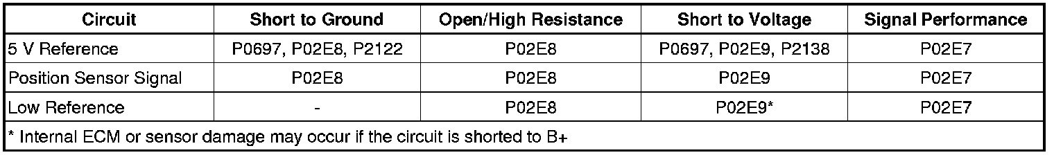 The ECM detects that the throttle valve position sensor voltage is less than 0.25 V for 5 s.