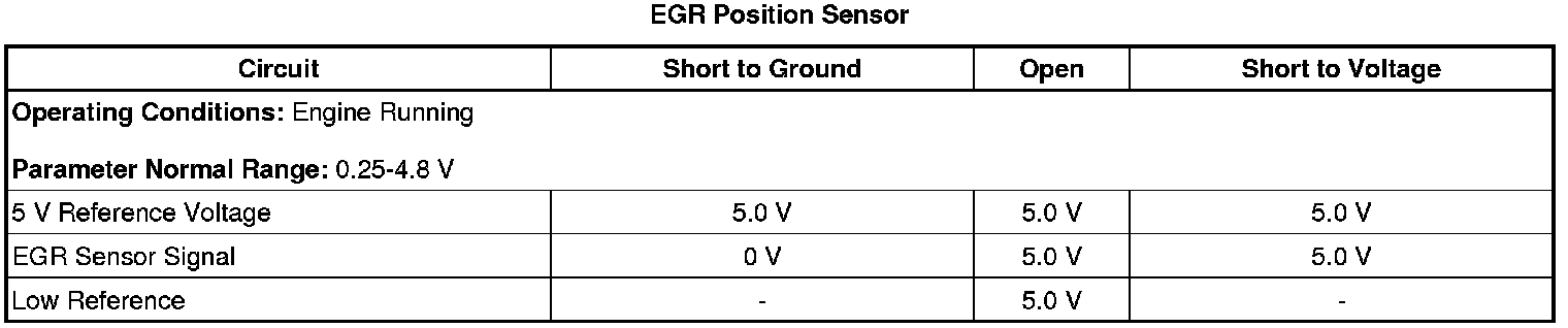 The ECM detects that the EGR position sensor voltage is less than 0.25 V for greater than 5 s.