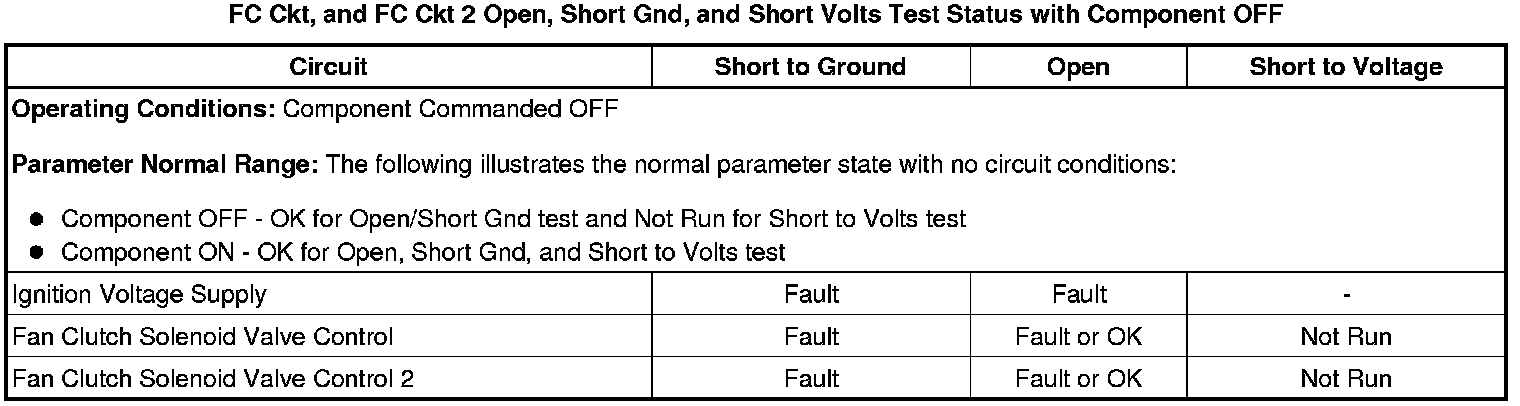 The scan tool FC Ckt 2 Test Status parameters can used in conjunction with the FC Ckt Test Status parameters to verify the integrity of the individual relay control circuits. If both the scan tool FC Ckt and FC Ckt 2 parameters indicate Fault in the respective Open Test Status then the condition is isolated to the portion of relay control circuit that is after the splice and common to both drivers. If Fault is indicated in only FC Ckt or FC Ckt 2, then the condition is isolated to the respective output driver and the portion of the circuit before the splice.
