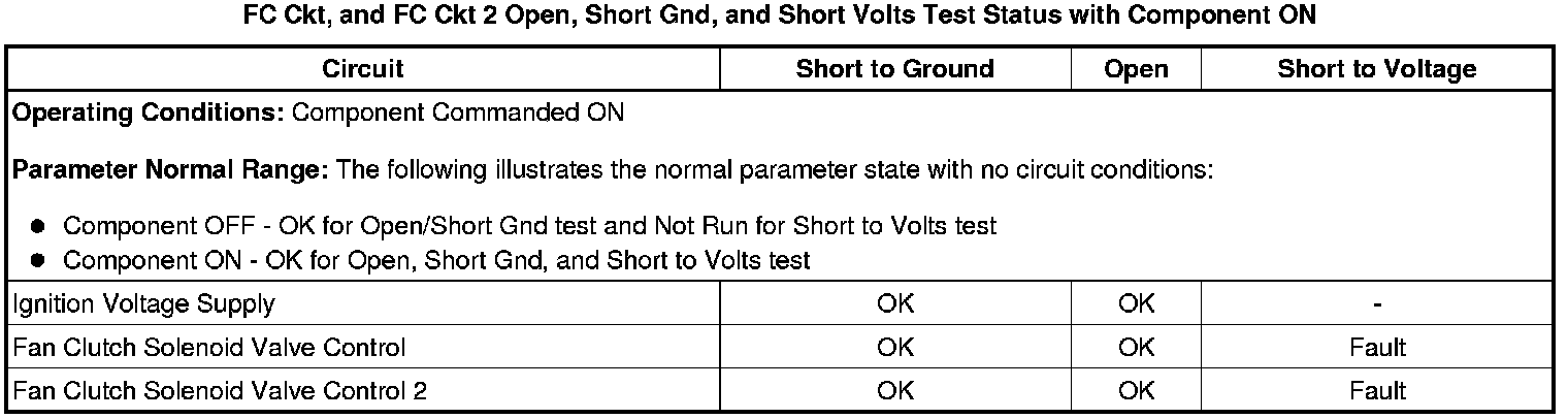 The scan tool FC Ckt 2 Test Status parameters can be used in conjunction with the FC Ckt Test Status parameters to verify the integrity of the individual control circuits. If both the scan tool FC Ckt and FC Ckt 2 parameters indicate Fault in the respective Open Test Status then the condition is isolated to the portion of relay control circuit that is after the splice and common to both drivers. If Fault is indicated in only FC Ckt or FC Ckt 2, then the condition is isolated to the respective output driver and the portion of the circuit before the splice.