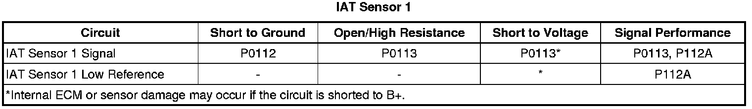 The fuel temperature sensor and intake air temperature (IAT) sensor 1 are variable resistors. The fuel temperature sensor is located in the fuel pump and the IAT Sensor 1 is part of the mass air flow intake air temperature (MAF/IAT) sensor assembly. The engine control module (ECM) supplies 5 V to the signal circuits, and a ground for each sensor's low reference circuit. The ECM monitors the and Fuel Temperature Sensor and IAT Sensor 1 circuits in order to calculate the temperature of the fuel and air. The ECM monitors the Fuel Temperature Sensor and IAT Sensor 1 signals for excessively high or low voltages, or for a voltage that is not in correlation with the other sensor's start up signal.