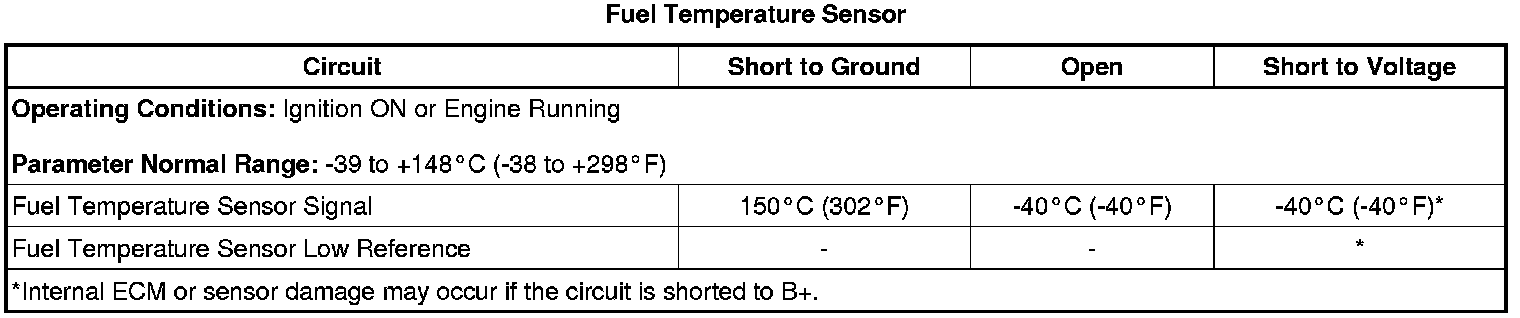 The ECM determines the absolute temperature difference between the Fuel Temperature Sensor and the IAT Sensor 1 signals is more than 100°C (180°F) at start up.