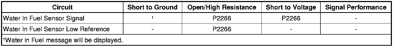 A sensor mounted in the bottom of the fuel filter housing is use to detect water in the fuel. The water in fuel sensor has an indicator control circuit and a low reference circuit. The engine control module (ECM) monitors the voltage to the water in fuel sensor. If the voltage is incorrect, the ECM will illuminate the water in fuel lamp and set the appropriate DTC.