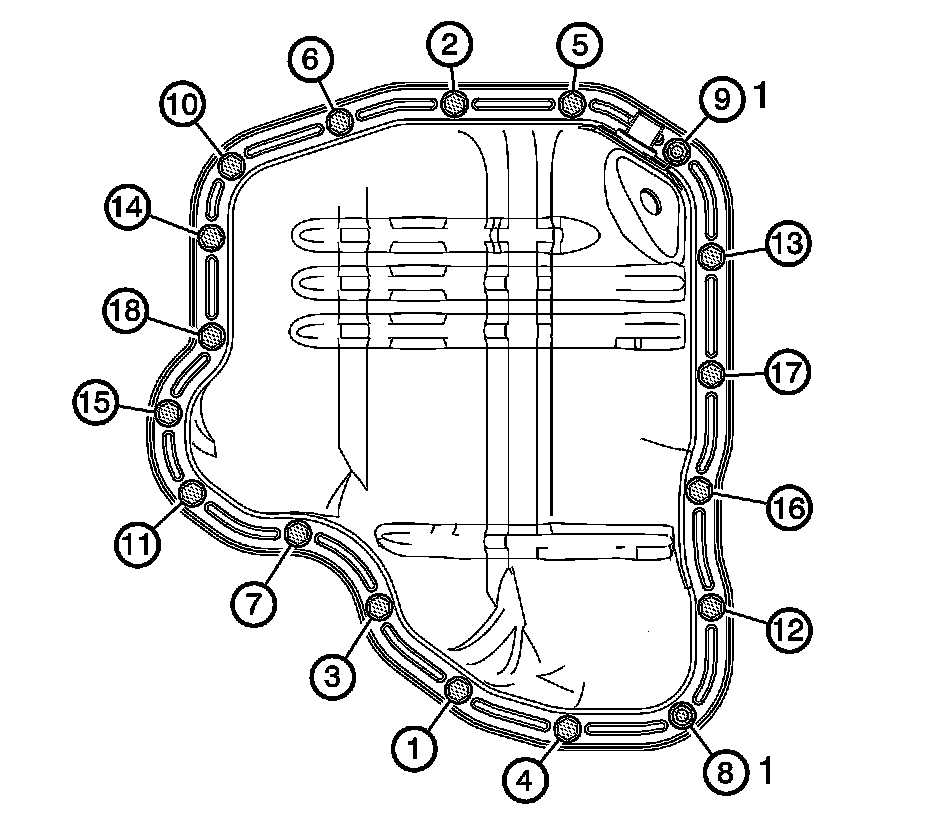 4. Tighten the lower oil pan bolts and nuts (1) in sequence to 10 Nm (89 lb in).