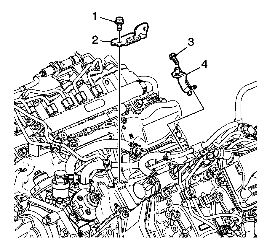25. Install the indirect fuel injector feed pipe clip bolts (4) and tighten to 10 Nm (89 lb in).