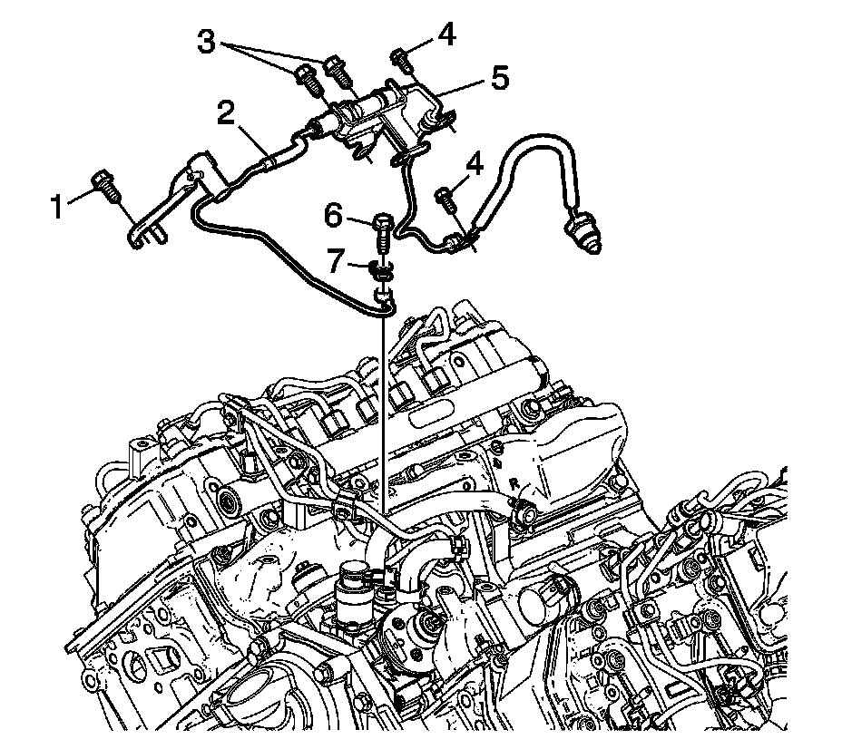 27. Install the indirect fuel injector feed pipe eye bolt (6) and washers (7) and tighten to 10 Nm (89 lb in).