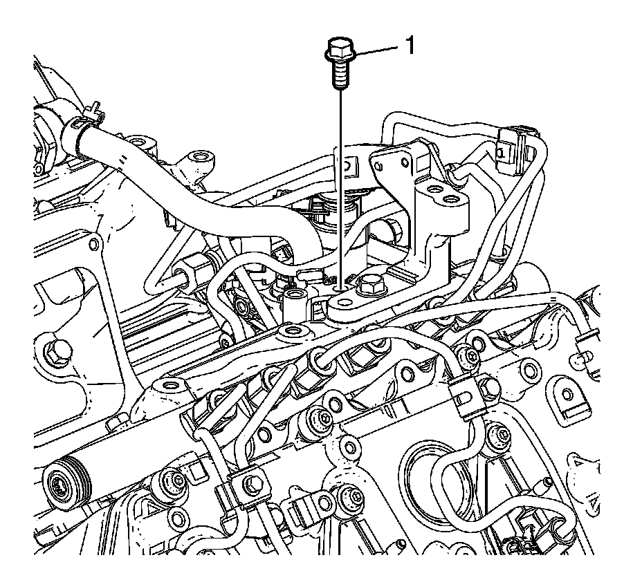 21. Install the high pressure fuel rail pipe bolt (1) and tighten to 10 Nm (89 lb in).
