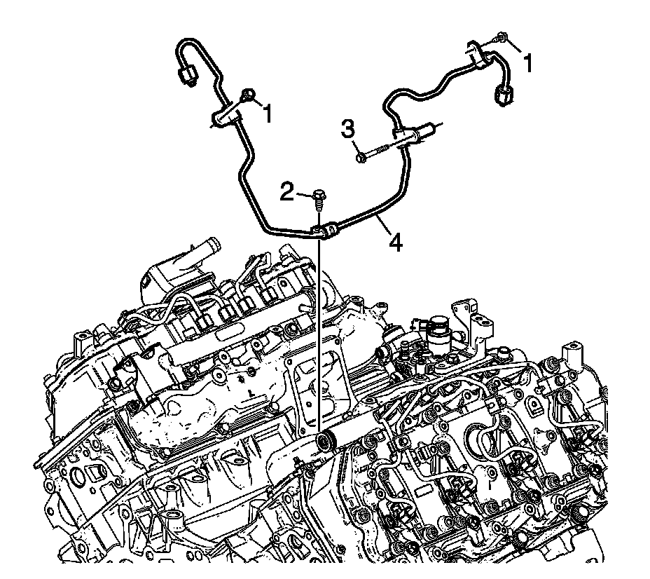 15. Install the high pressure fuel rail crossover pipe (4) and tighten to 30 Nm (22 lb ft).