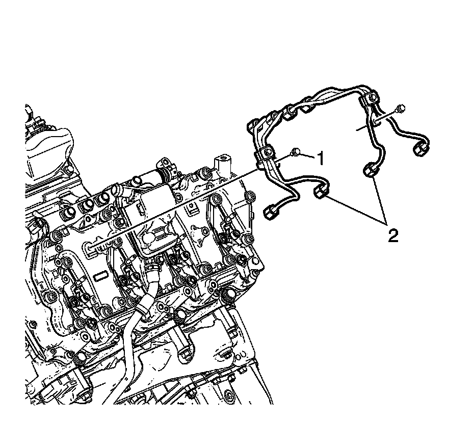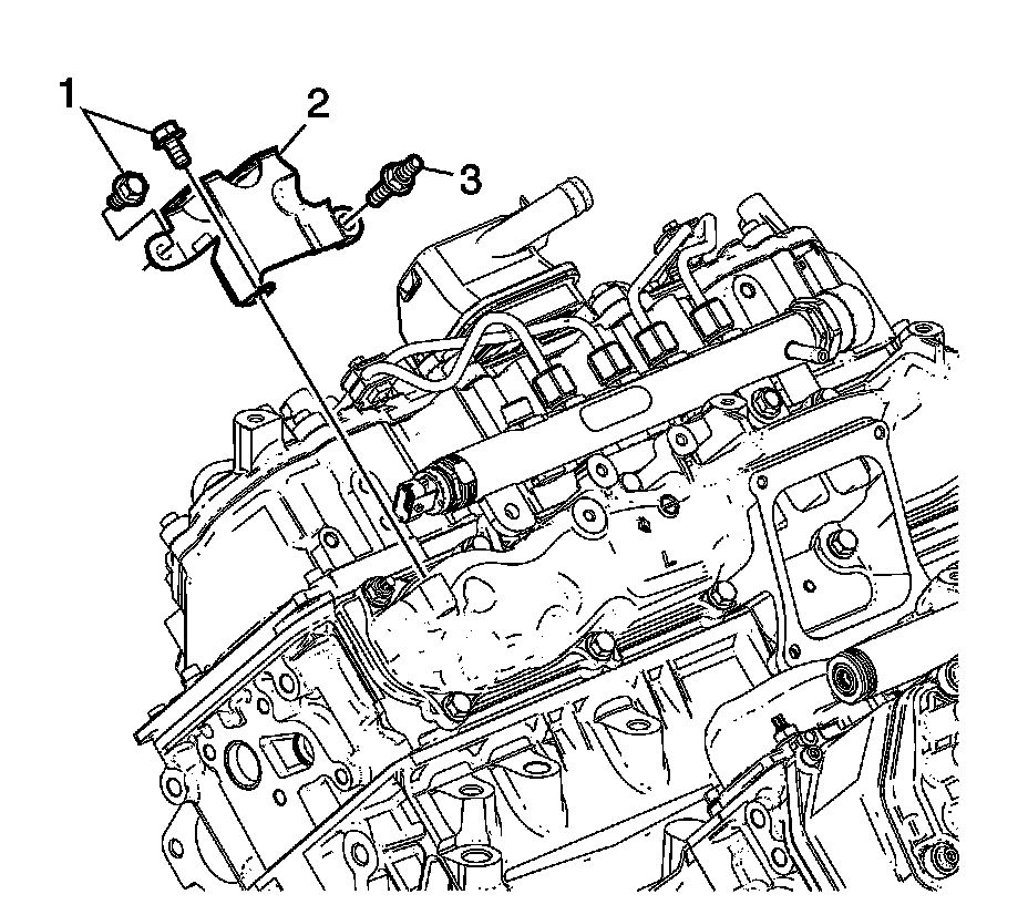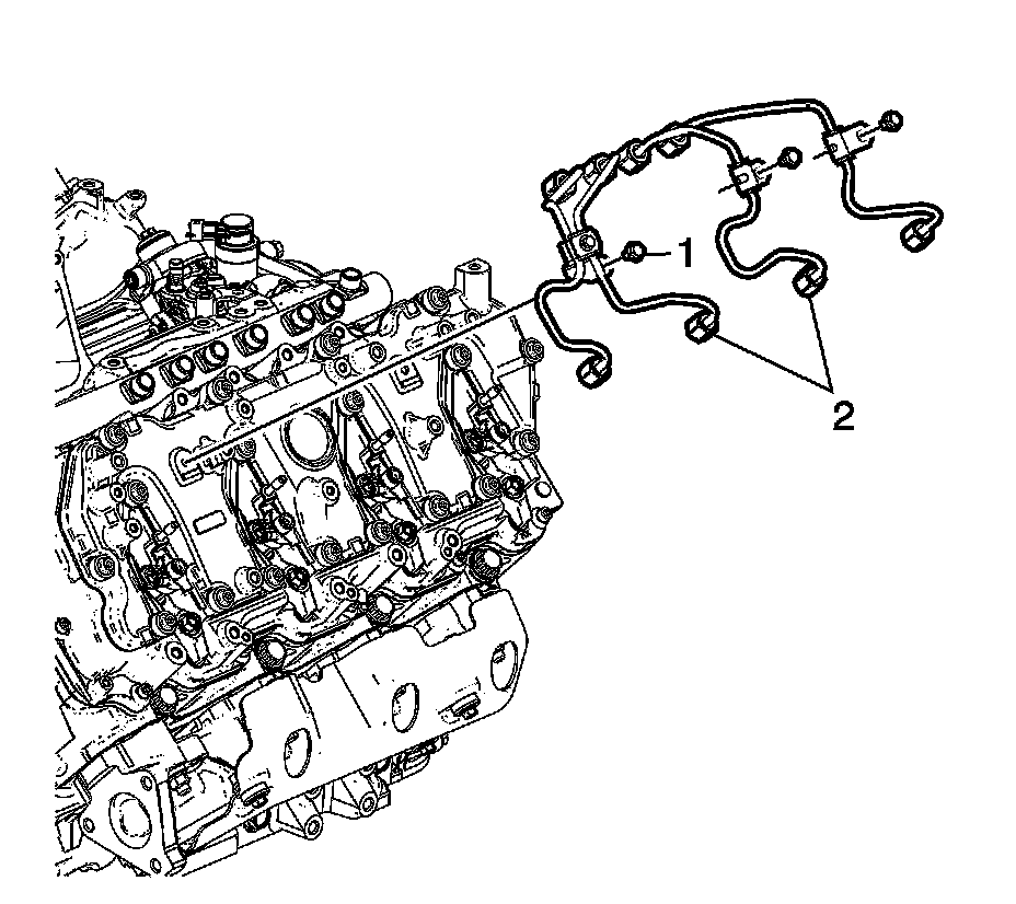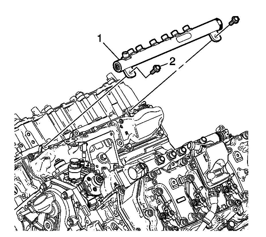 2. Install the left fuel rail bolt (2) and tighten to 25 Nm (18 lb ft).