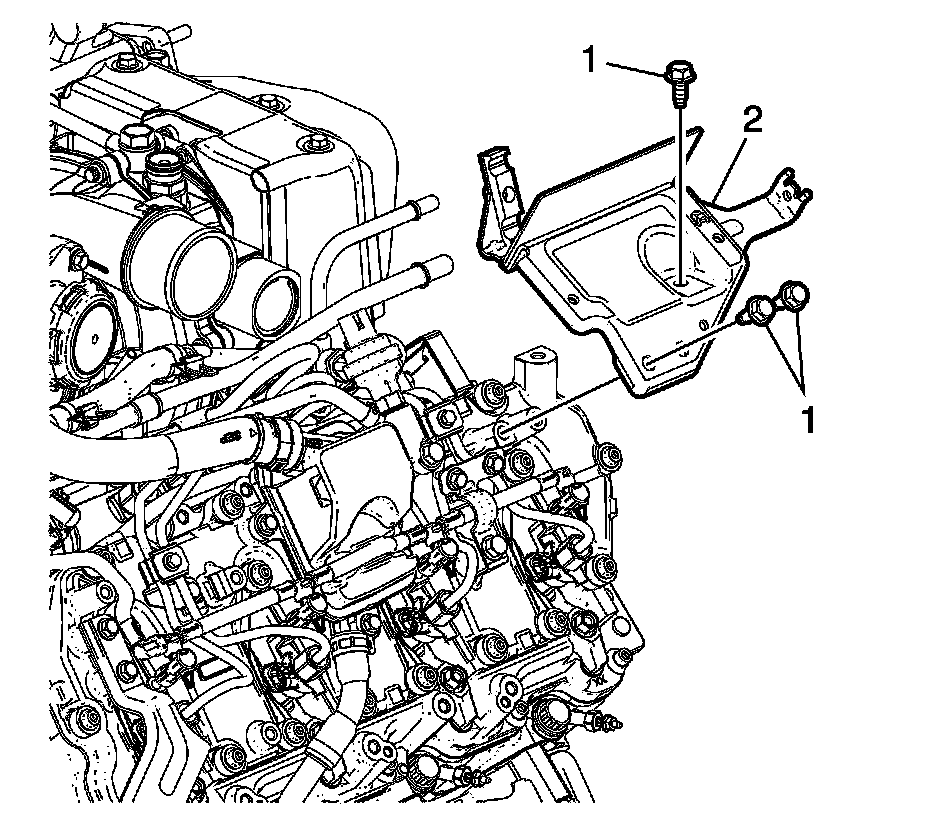 35. Install the left side engine wiring harness bolts (2) and tighten to 10 Nm (89 lb in).