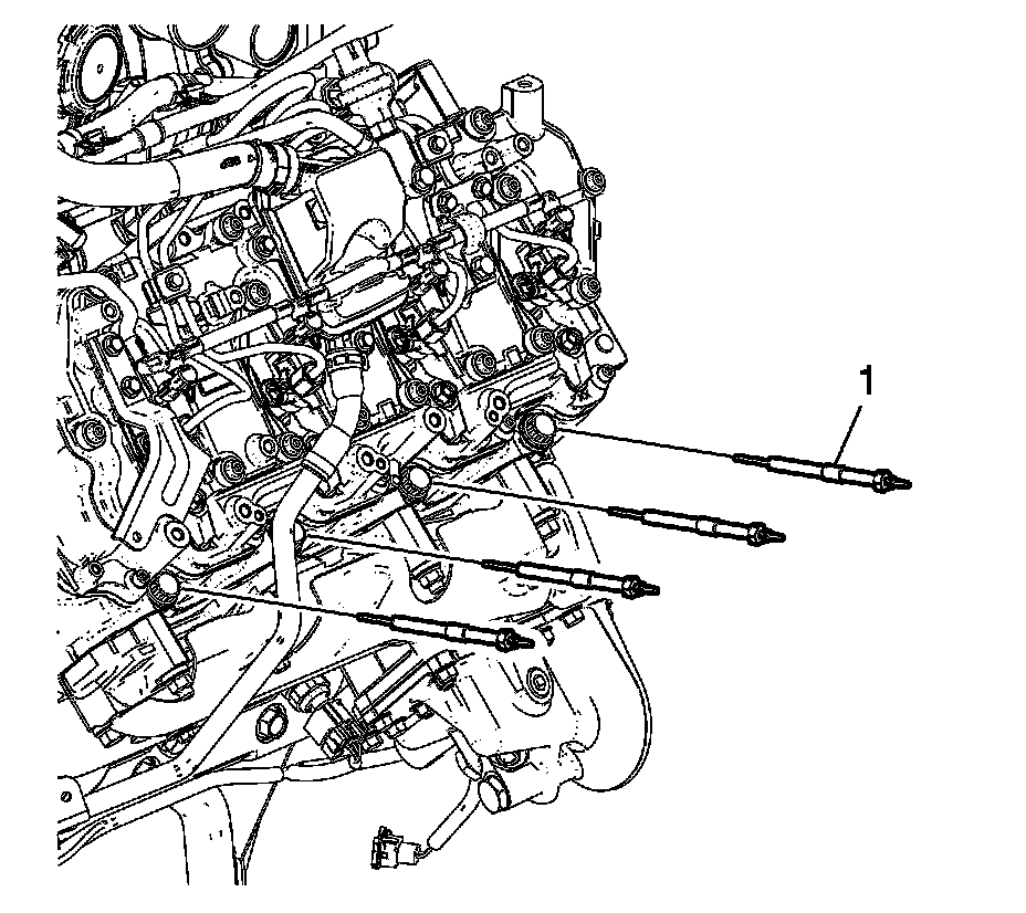 14. Install the glow plug controller bolts (1) and tighten to 10 Nm (89 lb in).