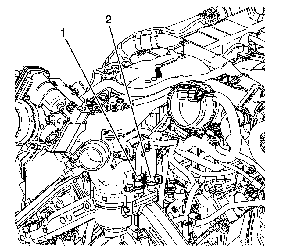 8. Connect the engine coolant temperature sensor (1) and the turbocharger coolant feed hose (2).