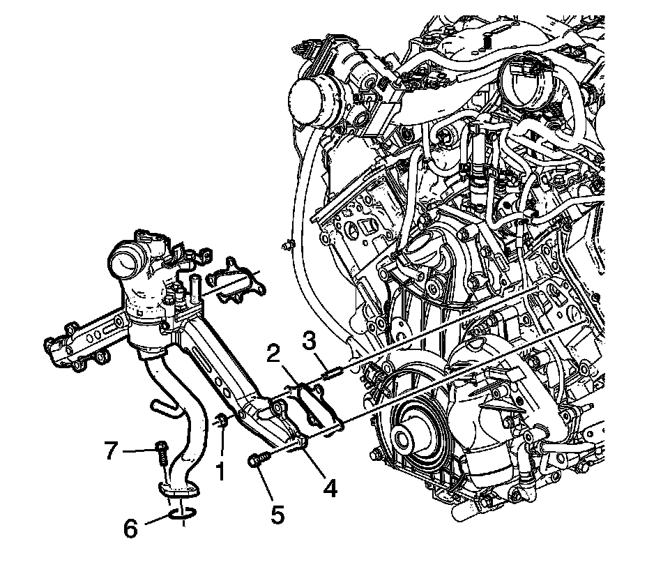 7. Install the thermostat bypass pipe bolts (7) and tighten to 25 Nm (18 lb ft).