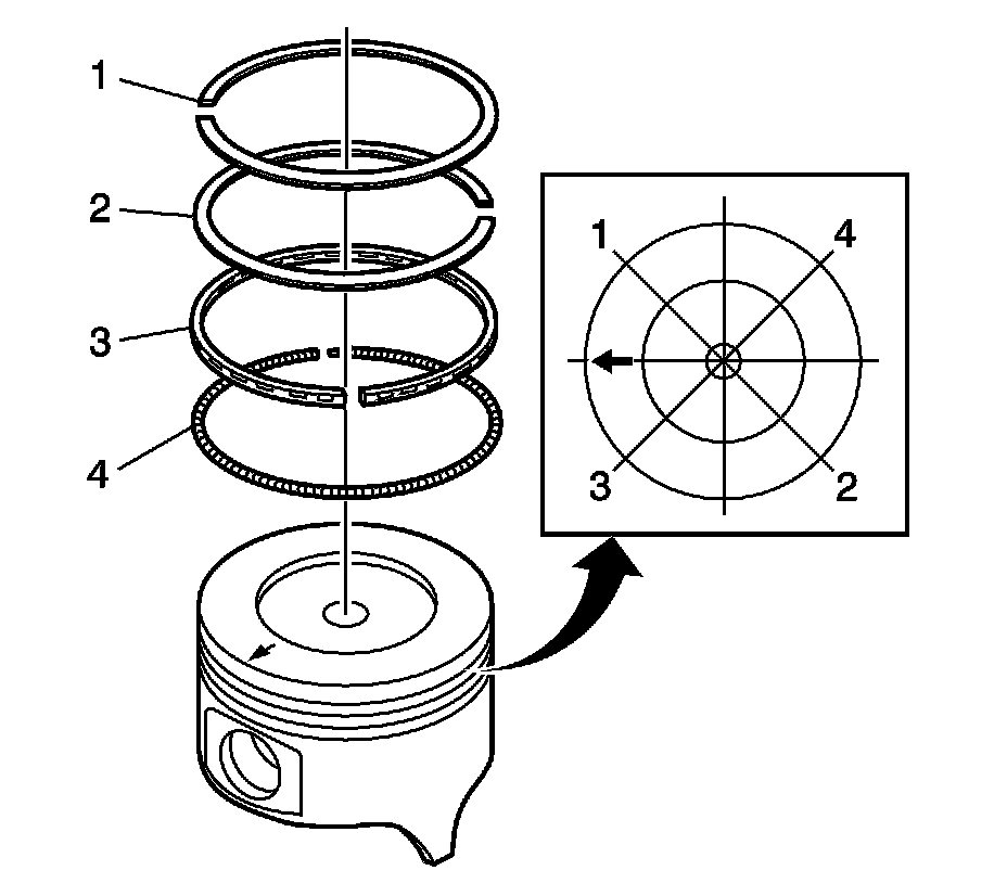 * The inner oil ring expander ring (3) gap should be 180 degrees from the oil ring rail (4) gap.