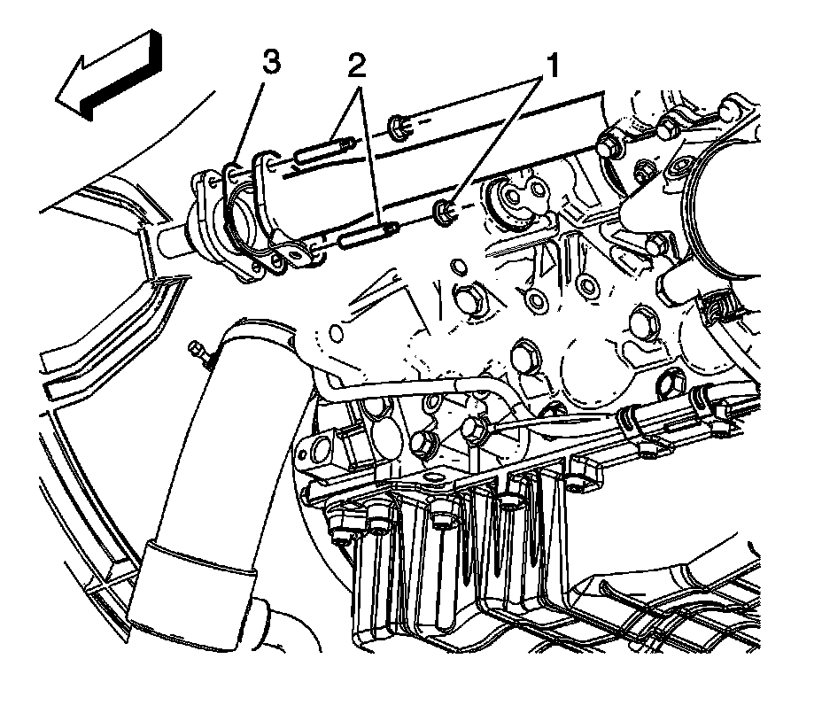 5. Remove the water pump to water pump outlet pipe studs (2) and discard the gasket (3).