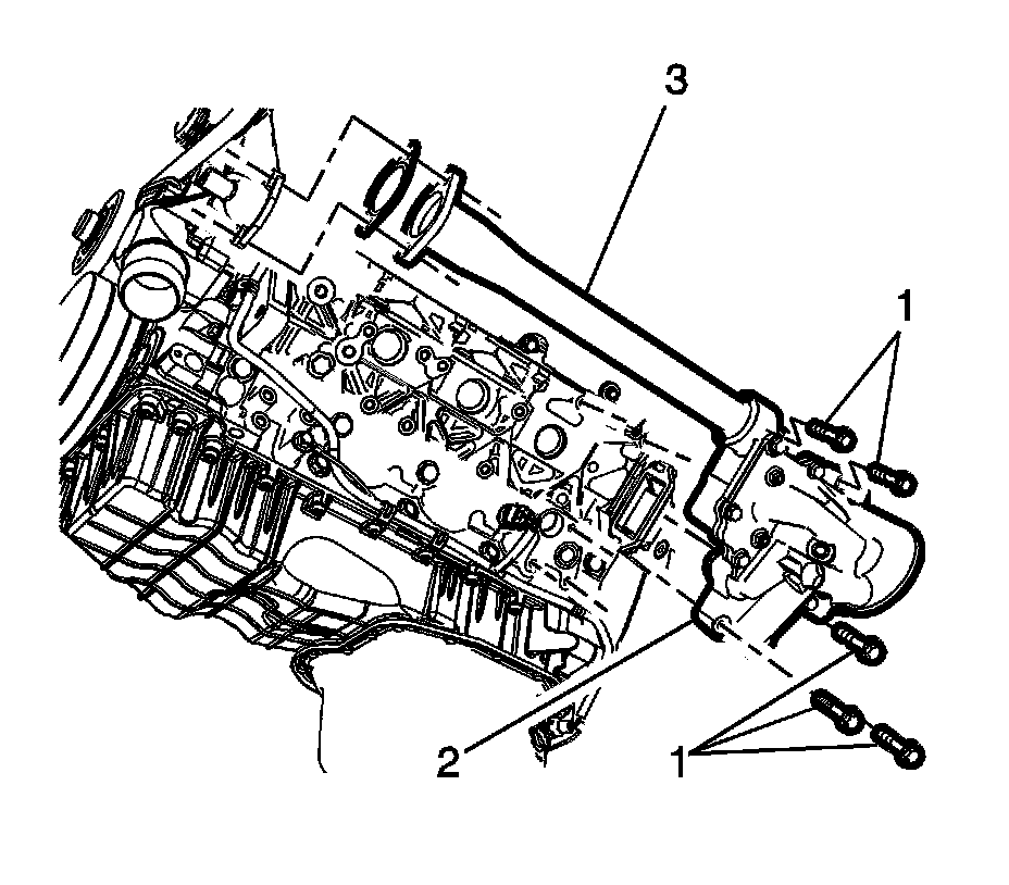 6. Remove the five oil filter adapter and oil cooler assembly bolts (1) and the water pump outlet pipe (3).