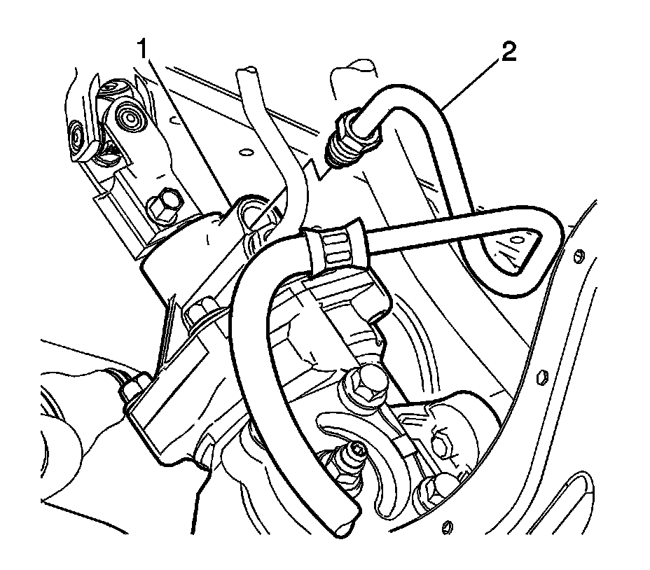 3. Connect the power steering cooler hose (2) to the steering gear (1) and tighten the fitting to 34 Nm (25 lb in).