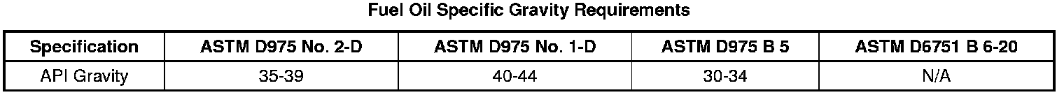 4. Refer to the Fuel Oil Specific Gravity Requirements table. If the correct fuel is being used in the conditions listed in Fuel Quality, refer to Fuel System Specifications [1][2]Fuel Delivery and Air Induction , and meets fuel oil specific gravity requirements, the fuel is OK. If not, the fuel should be replaced.