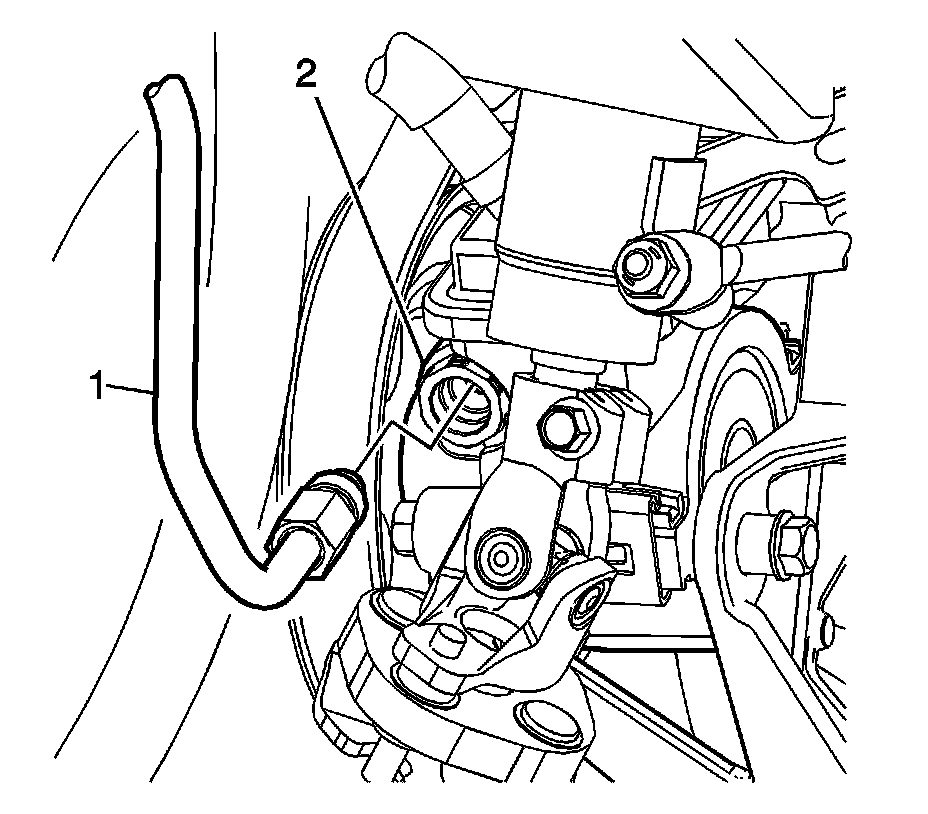 4. From the left front wheel well, connect the power brake booster inlet hose (1) to the power steering pump (2). Tighten the hose fitting to 34 Nm (25 lb ft).