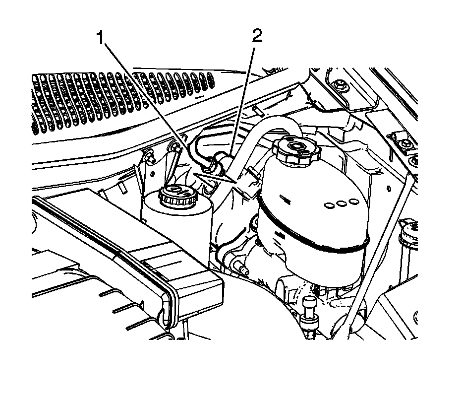 5. From the left front wheel well, disconnect the power brake booster inlet hose (1) from the power steering pump (2).