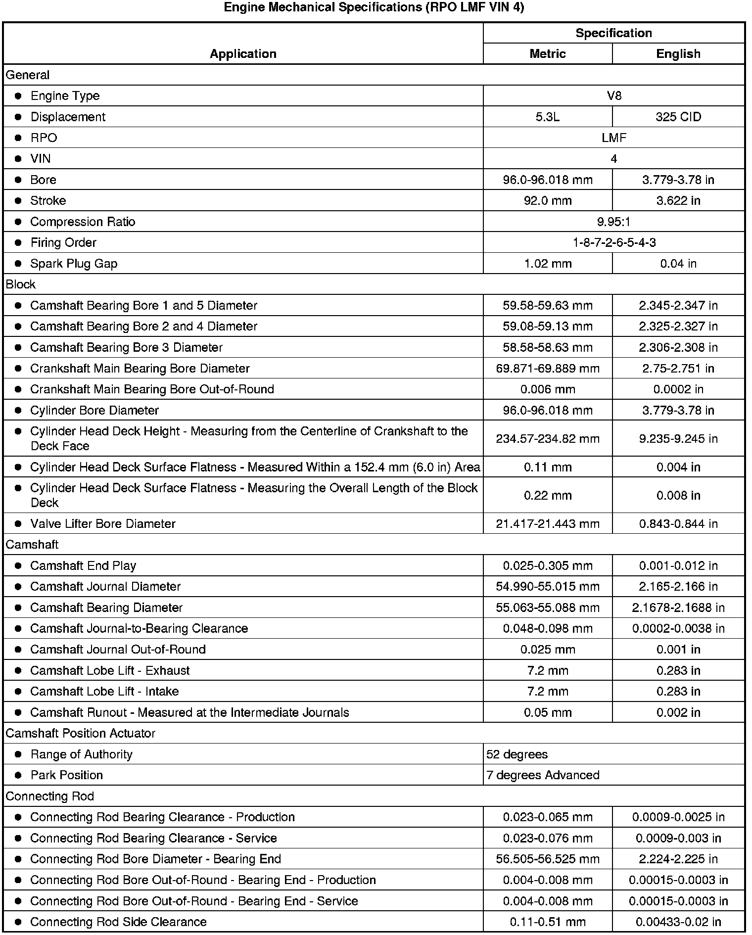 Engine Mechanical Specifications (RPO LMF VIN 4)