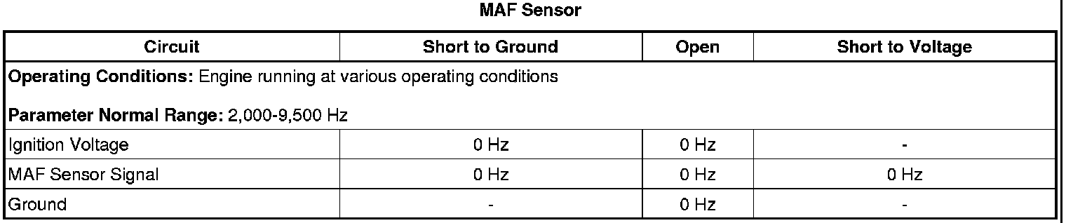The ECM applies 5 V to the MAF sensor on the MAF sensor signal circuit. The sensor uses the voltage to produce a frequency based on the inlet air flow through the sensor bore. The frequency varies within a range of near 2,000 Hertz at idle to near 9,700 Hertz at maximum engine load.