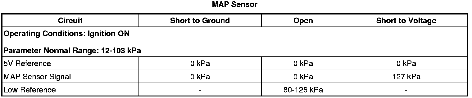 Under normal operation the highest pressure that can exist in the intake manifold is equal to BARO. This occurs when the vehicle is operated at wide-open throttle (WOT) or when the ignition is on while the engine is off. Under these conditions, the ECM uses the MAP sensor to determine the current BARO. The lowest manifold pressures occur when the vehicle is idling or decelerating. MAP can range from 10 kPa, when pressures are low, to as much as 104 kPa when pressures are high, depending on the BARO. The ECM monitors the MAP sensor signal for pressure outside of the normal range.