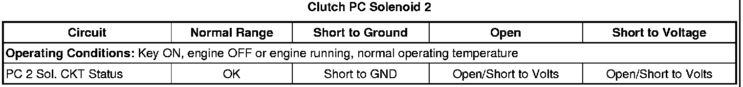 3. Engine ON, observe the scan tool Clutch PC 2 Sol. CKT Status parameter. The reading should display OK or Indeterminate.