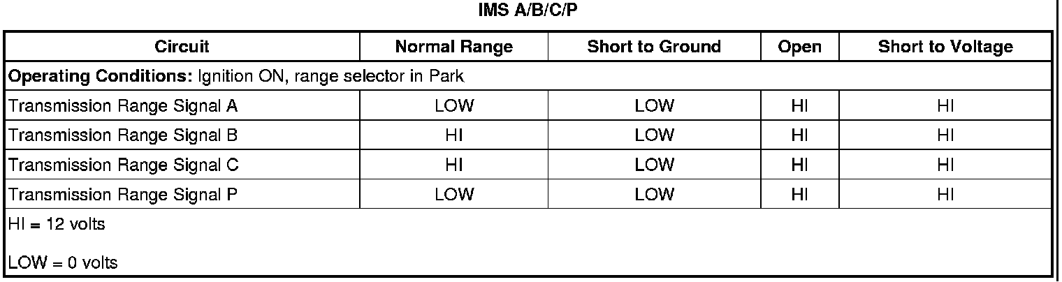 * The IMS signal circuit A, B, or P are Low in Park for greater than 8 seconds.
