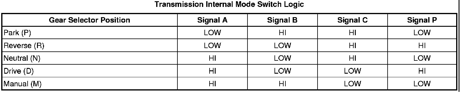 The automatic transmission manual shift shaft position switch assembly, also called the transmission internal mode switch assembly, is a dual sliding contact switch attached to the control valve body within the transmission. The 9 outputs from the switch indicate which position is selected by the transmission manual shaft. Four outputs (A, B, C, P) are range selection inputs to the transmission control module (TCM). Five outputs (R1, R2, D1, D2, S) are direction selection inputs to the hybrid powertrain control module. The input voltage at the modules is high when the switch is open and low when the switch is closed to ground. The state of each input is displayed on the scan tool as IMS Range and IMS Direction. The IMS Range input parameters represented are transmission range signal A, signal B, signal C, and signal P. The IMS Direction input parameters represented are transmission direction signal R1, signal R2, signal D1, signal D2, and signal Start.